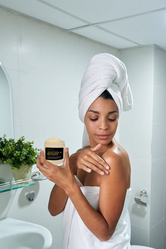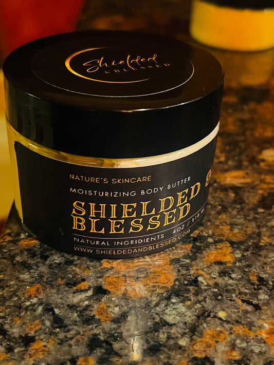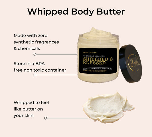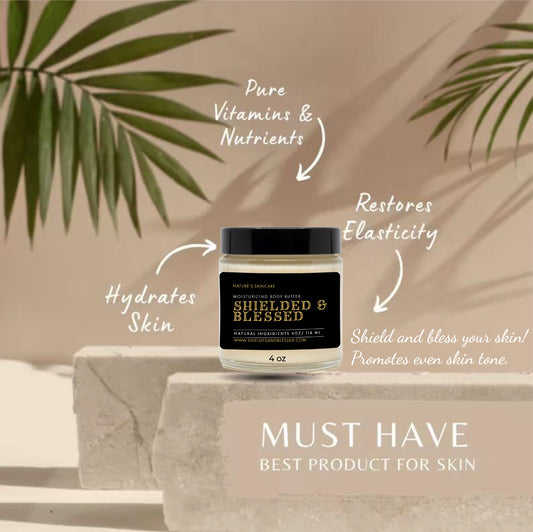 Our raw shea and mango butter deeply hydrates while keeping your skin soft, glowing, and protected - just like a shield of nourishment!